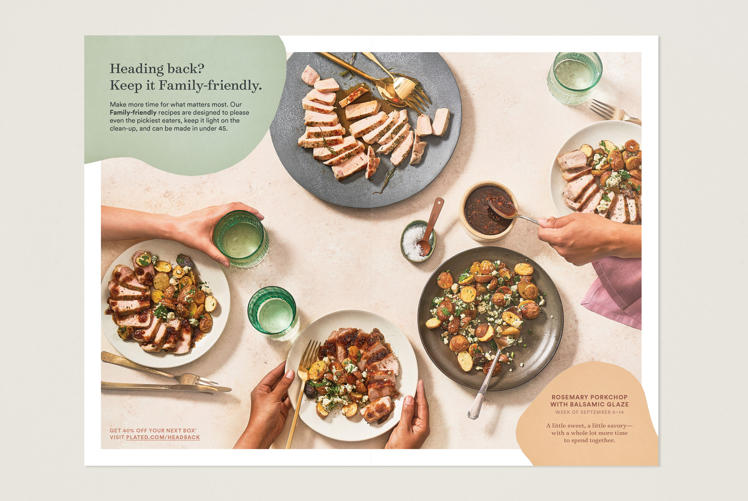 Just one of the many campaigns I helped spearhead while at Plated was our Back to School Campaign for 2019. Our challenge was to show customers how Plated, not only fits into their lives when schedules get hectic, but also to make the time spent together memorable.