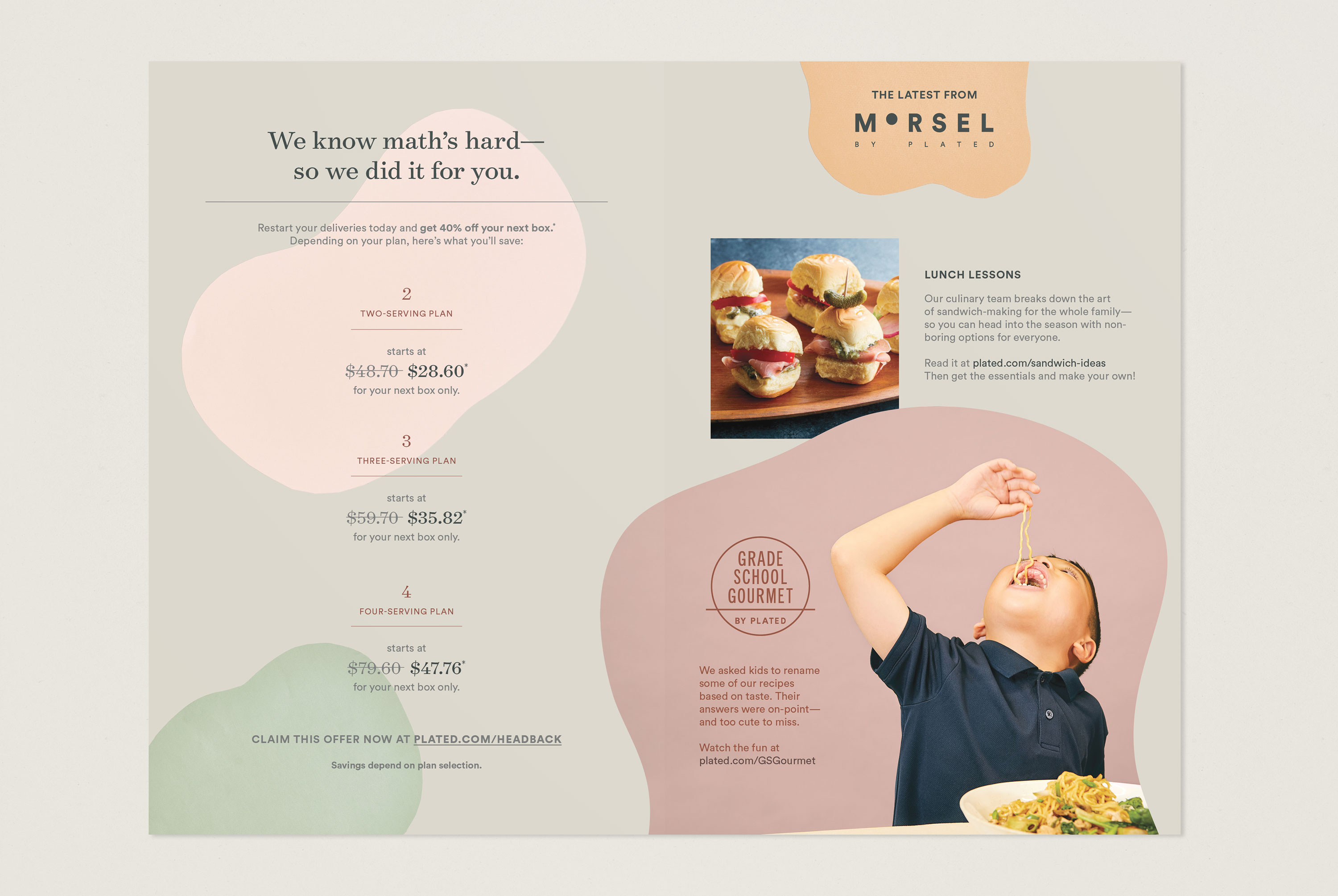 The original branding for Plated did not work hard enough to set their meal kit apart from competitors. Working with my Creative Director and Art Director, I advised on and wrote completely new branding for Plated. This task included: